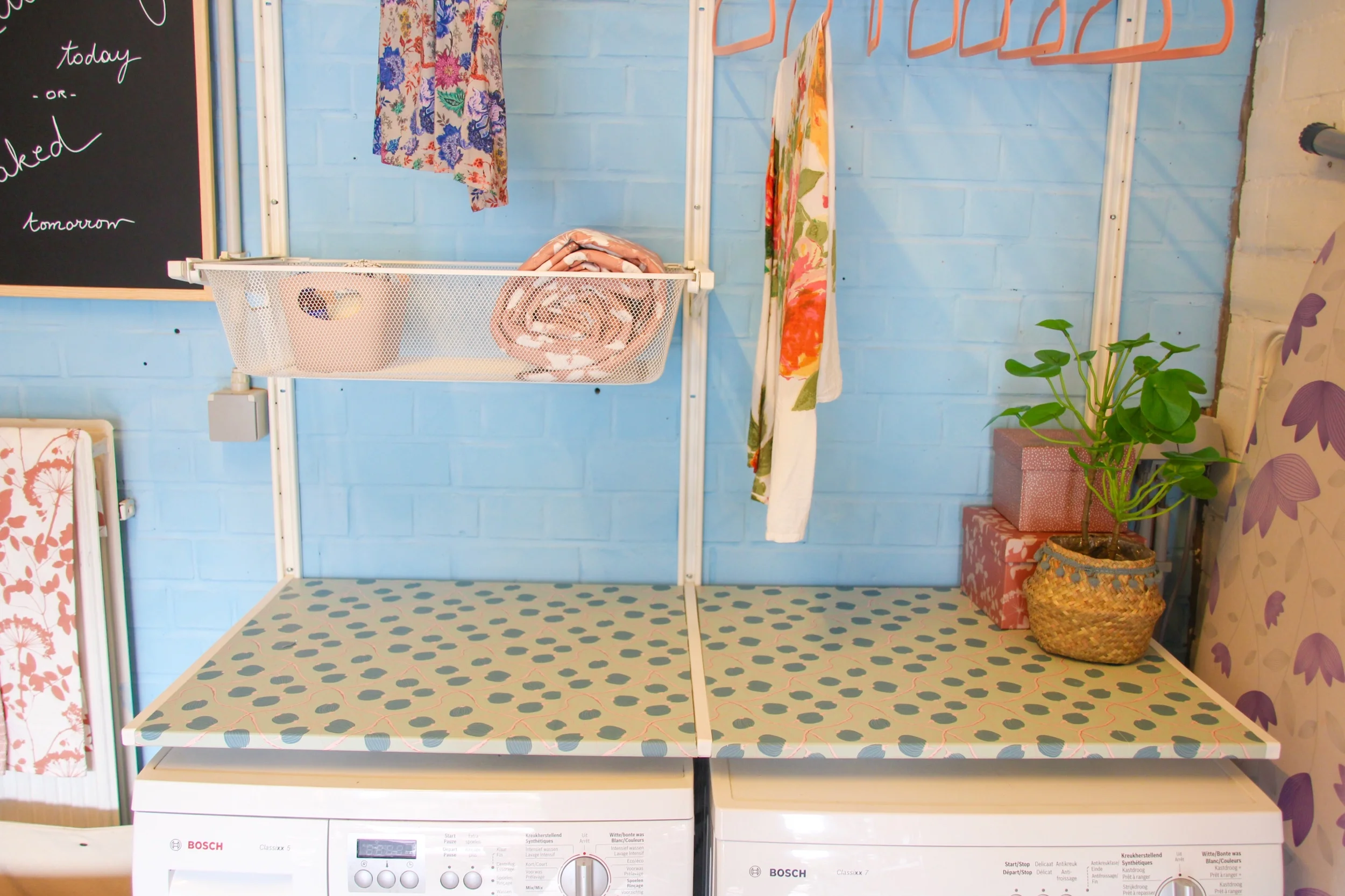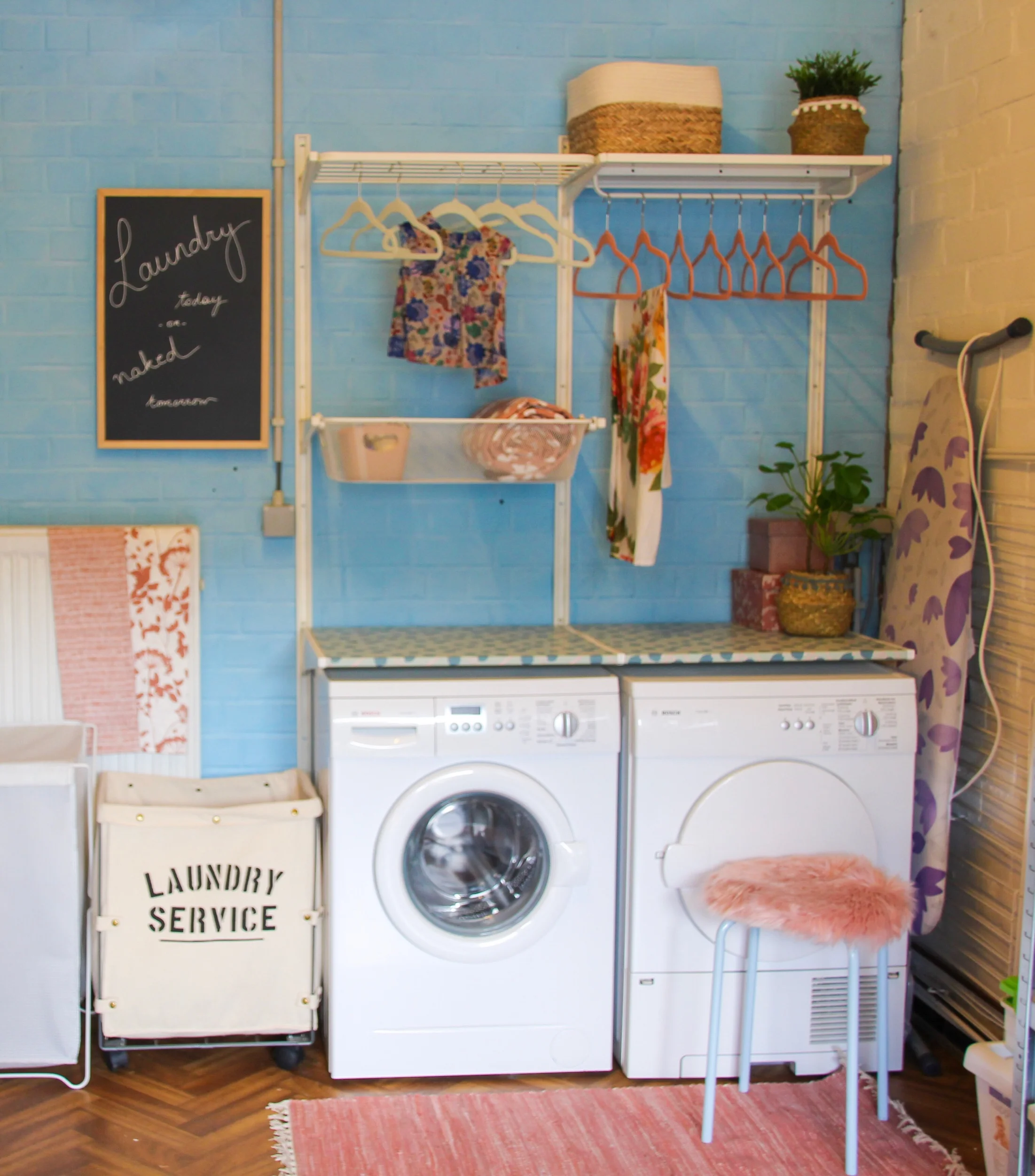 My granddad and sister, Olivia, are the ones we call in the family when precise measurements have to take place, things have to be put together or holes have to be drilled. They put up the Algot system and after that I went on some alone shopping to spice up the place. I got a great idea at Sostrene Grene to apply self-adhesive decorative paper to the folding table and then went shopping for accessories in those blues and pinks at Kwantum and Jysk. No one said this had to cost a fortune right?