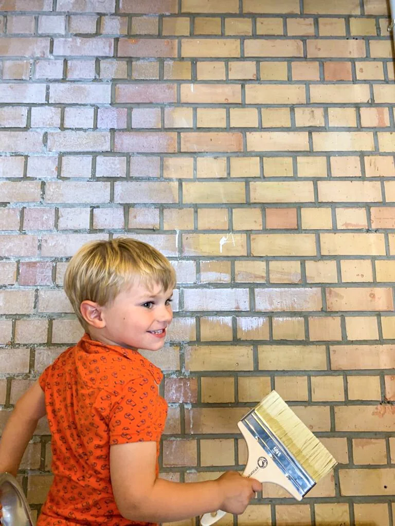 I’m so thankful for my sisters and grandfather who were immediately excited about coming over to help. They primered the brick wall and then we sat down to mix the color we wanted. Mix, you say? Yes, we used Stoopen & Meeus limestone powder you can create just about any color in by mixing one, two or all three powders! Click here to see the range of colors you can choose from. Whereas the primer isn’t interesting for a pregnant lady to be around, the paint was no problem at all as it is all-natural and non-toxic. Elliot and Amelia had the time of their lives helping us stir the “potion” until we got the powder blue we were aiming for. We used regular kitchen bowls and utensils because the paint washes out easily with warm water.
